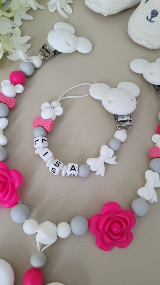 Schnullerkette mit Namen für Mädchen Maus & Schleife pink