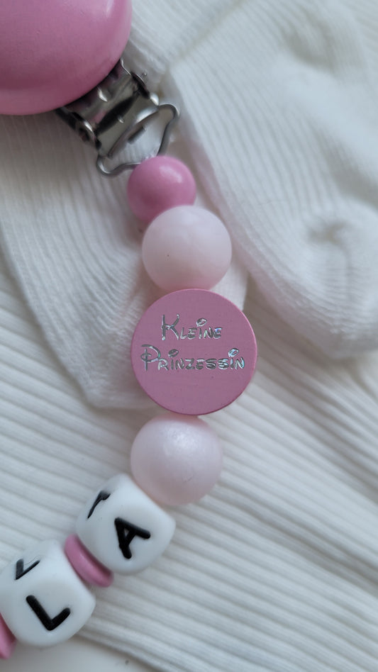 Die zarten Pastelltöne in Rosa, Creme oder lieber bunt. Jede Schnullerkette ein perfektes Accessoire für kleine Prinzessinnen. Der personalisierte Name sorgt dafür, dassder Schnuller nicht mehr verloren geht und die Kette zu einem ganz besonderem Unikat wird.