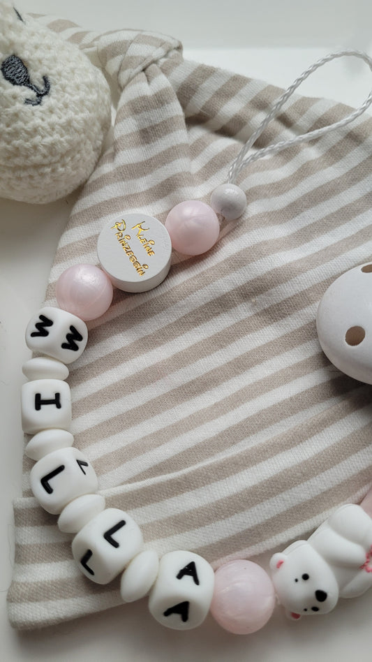 Schnullerkette mit Namen für Mädchen Eisbärchen rosa perlmutt weiss