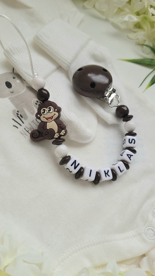 Schnullerkette mit Namen für Jungen Affe braun weiß