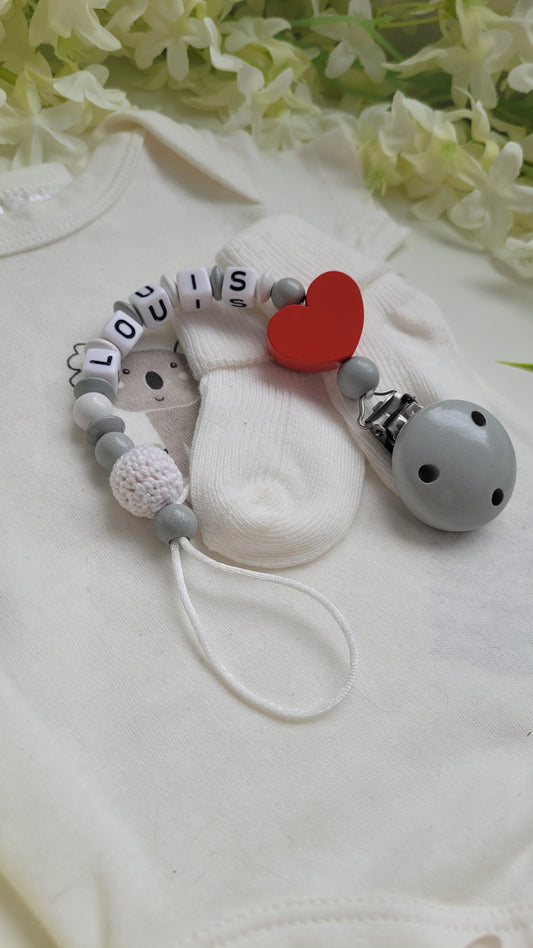 Schnullerkette mit Namen für Jungen Herz grau weiss