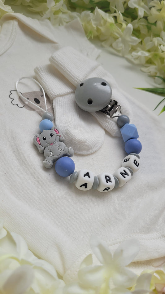 Schnullerkette mit Namen für Jungen Elefant blau