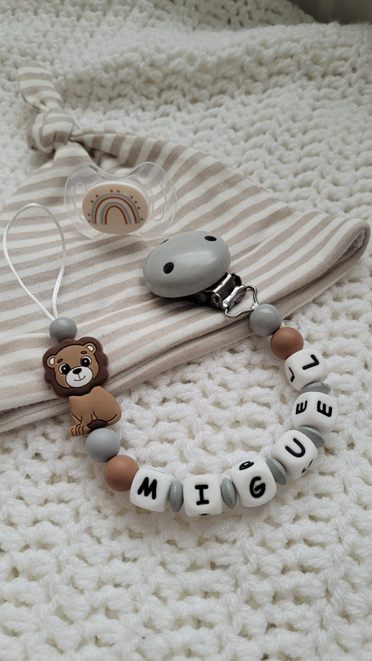 Schnullerkette Löwe Silikon mit Namen grau weiss