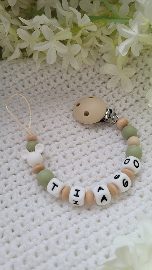 Schnullerkette mit Namen für Jungen Maus sanft grün personalisiert mit Namen
