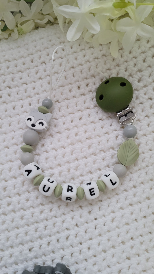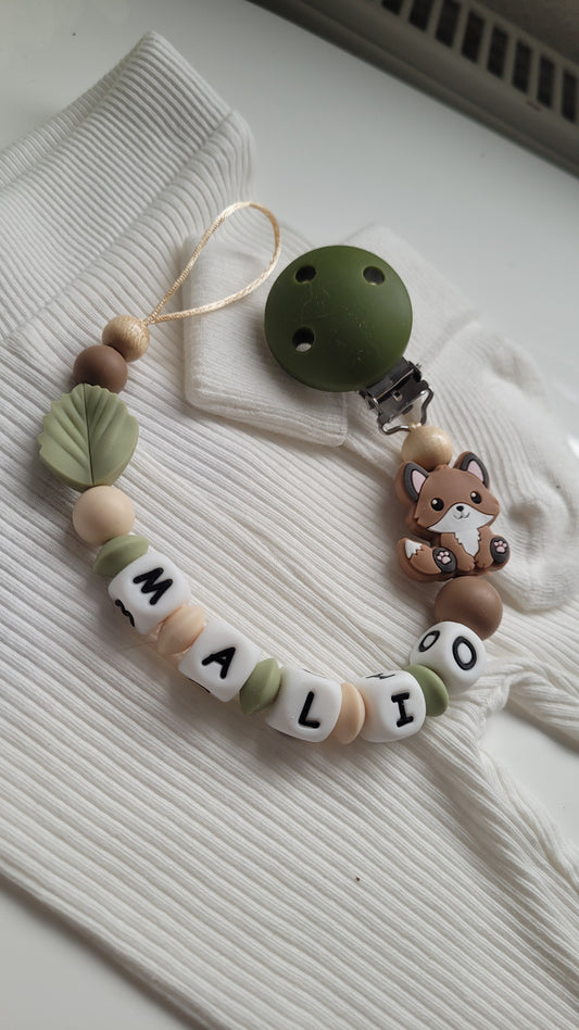 Schnullerkette mit Namen für Jungen Fuchs grün beige