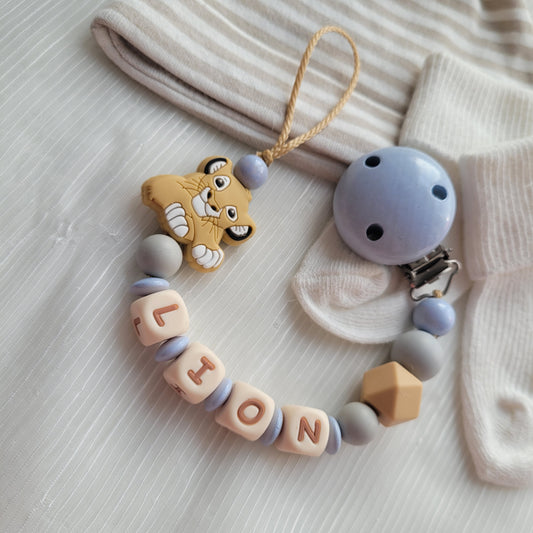 Schnullerkette mit Namen für Jungen Löwe graublau beige
