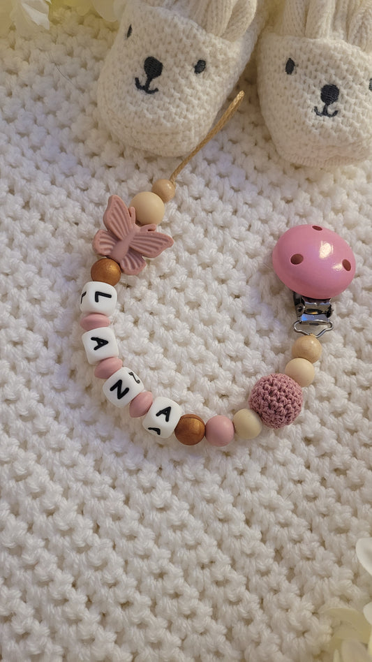 Schnullerkette mit Namen für Mädchen Schmetterling Beige rose