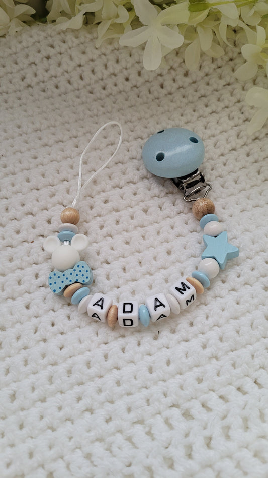 Schnullerkette mit Namen für Jungen Maus babyblau holz