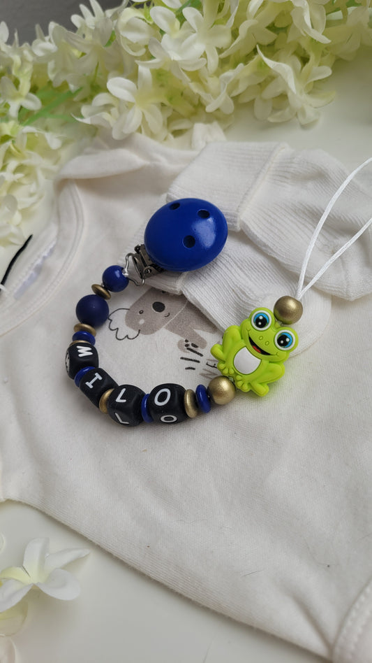 Schnullerkette mit Namen für Jungen königlich Frosch blau gold