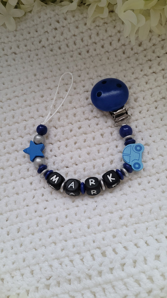 Schnullerkette mit Namen für Jungen Auto blau silber