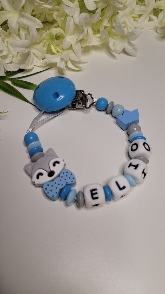 Kinderwagenkette & Schnullerkette Fuchs personalisiert blau grau
