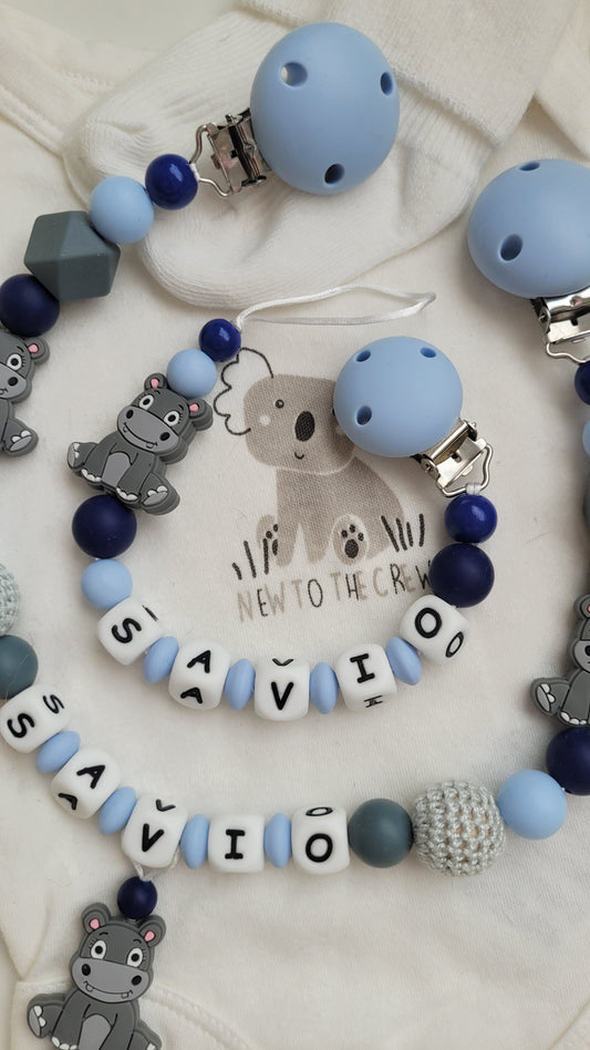 Kinderwagenkette & Schnullerkette *Nilpferd* hellblau