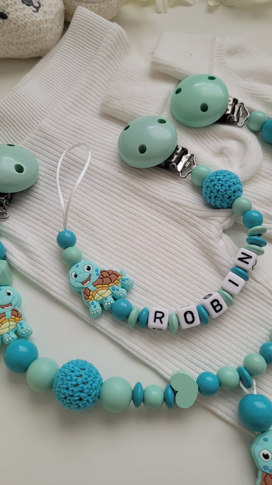 Kinderwagenkette & Schnullerkette mit Namen Schildkröte mint türkis