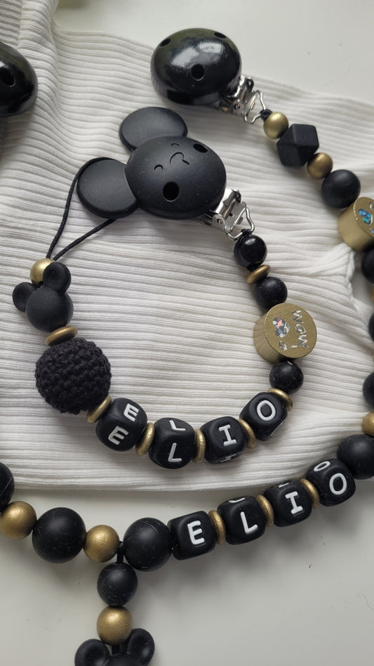 Kinderwagenkette & Schnullerkette mit Namen schwarz gold