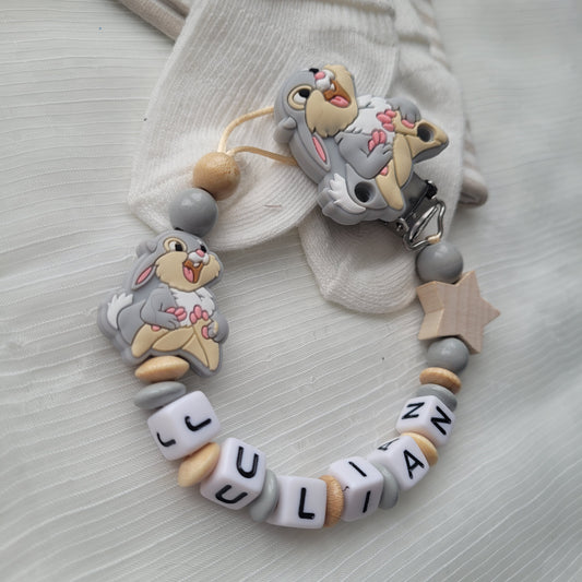 Kinderwagenkette & Schnullerkette mit Namen Hase grau holz
