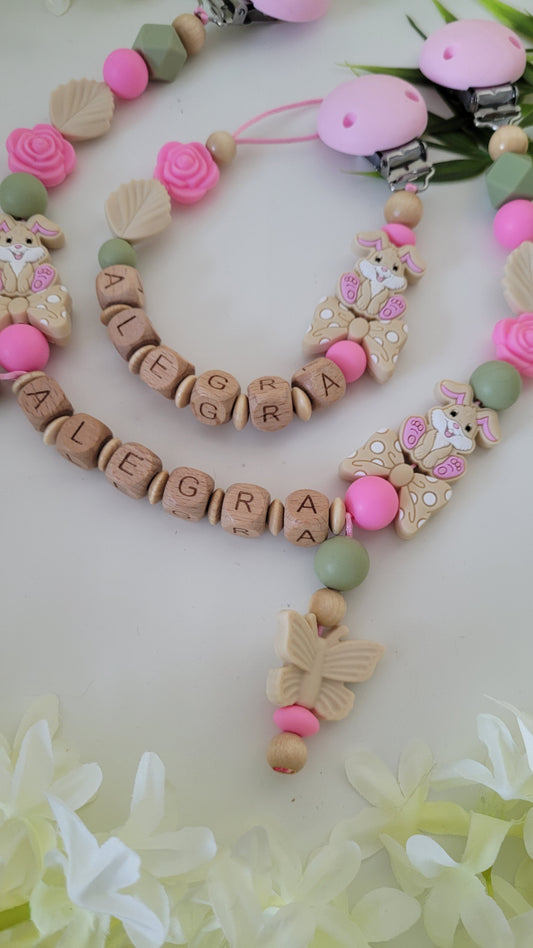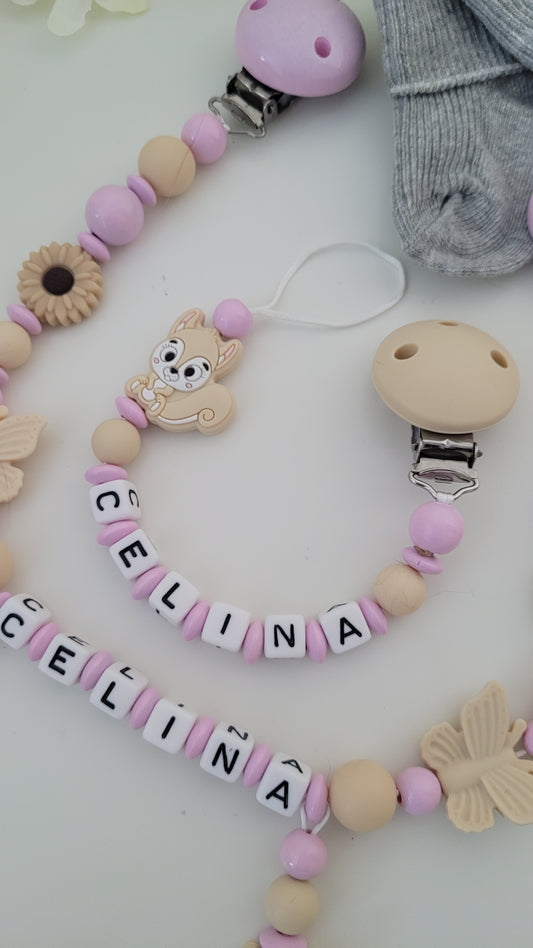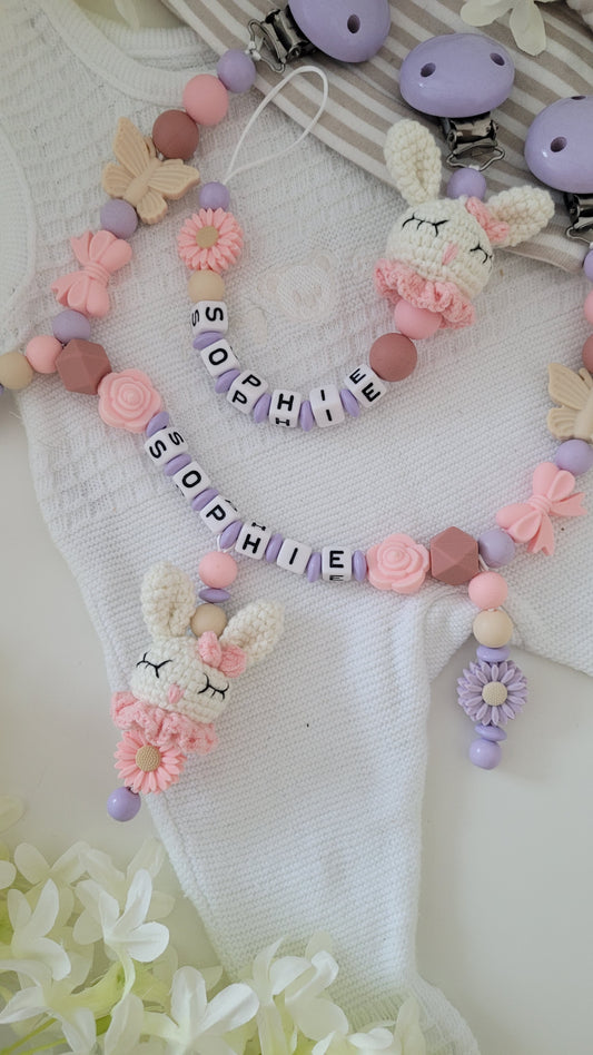Kinderwagenkette & Schnullerkette mit Namen *Hase* apricot flieder