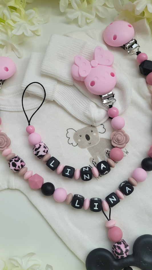 Kinderwagenkette & Schnullerkette mit Namen für Mädchen *Leomaus* schwarz rosa