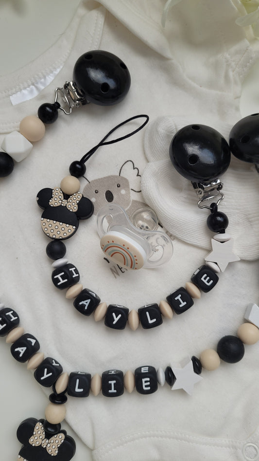 Kinderwagenkette & Schnullerkette *Minnie Prinzessin* beige schwarz