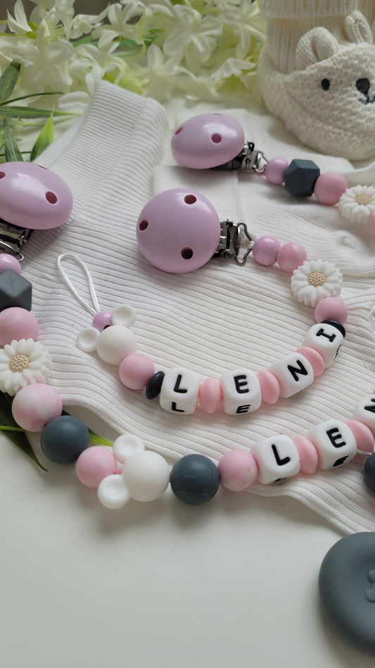 Kinderwagenkette & Schnullerkette *Minnie* grau rosa