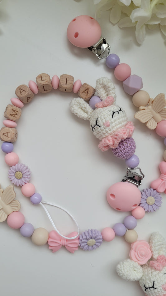 Kinderwagenkette & Schnullerkette *Häkelhase* peach flieder