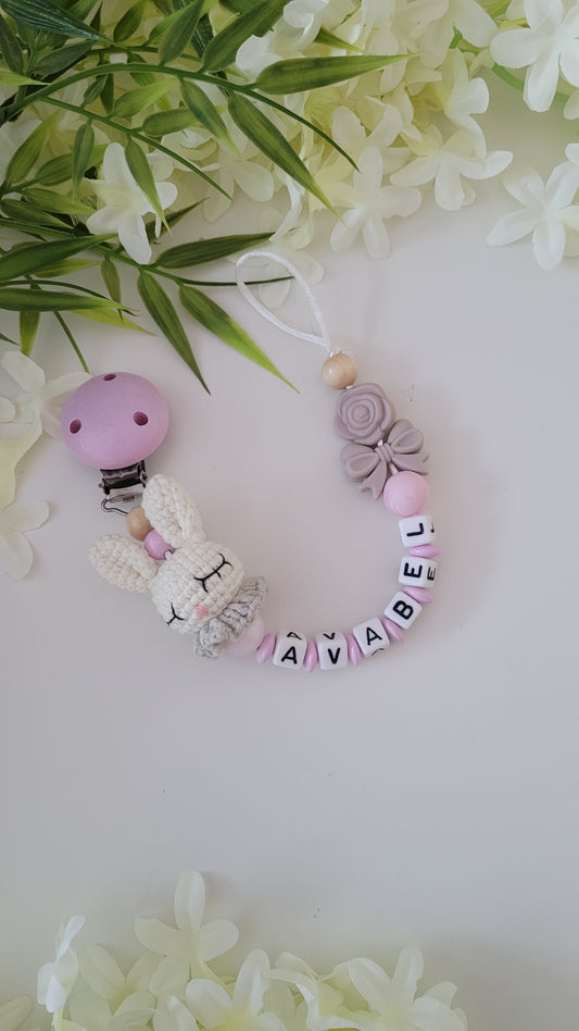 Kinderwagenkette & Schnullerkette mit Namen Häschen rosa marmor graurose