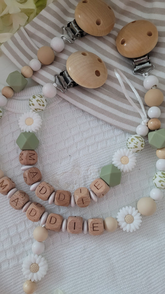 Kinderwagenkette & Schnullerkette mit Namen Gänseblümchen