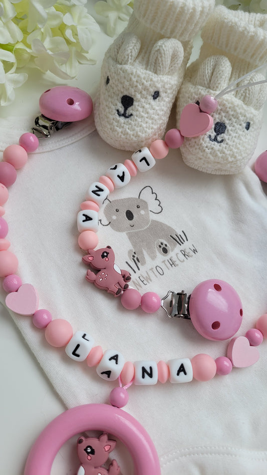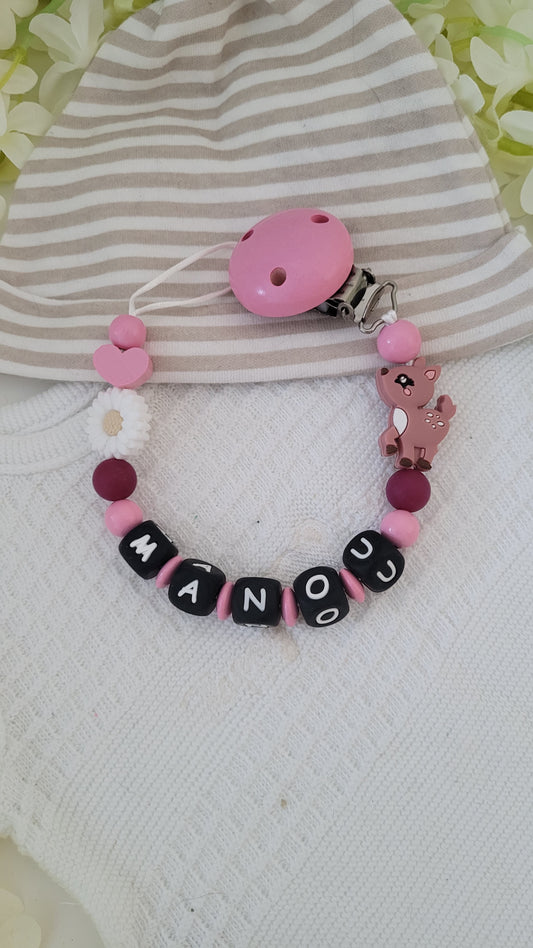 Kinderwagenkette & Schnullerkette mit Namen Rehkitz peach rosa