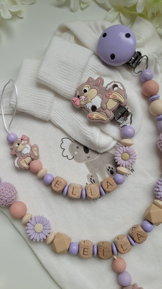 Kinderwagenkette & Schnullerkette Set lila Blumen Hase