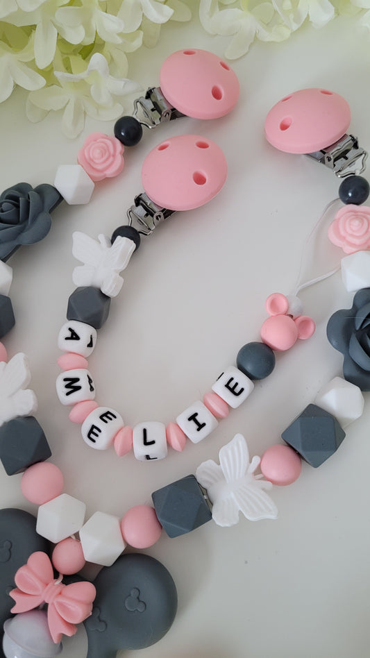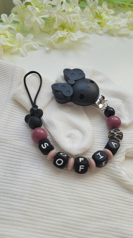 Kinderwagenkette & Schnullerkette mit Namen für Mädchen Minniemaus schwarz graurose