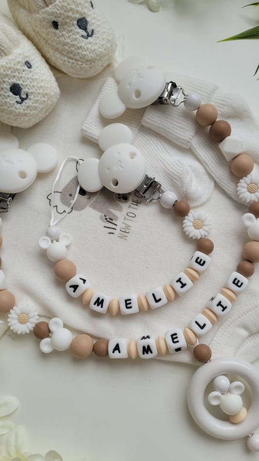 Kinderwagenkette & Schnullerkette mit Namen Maus beige