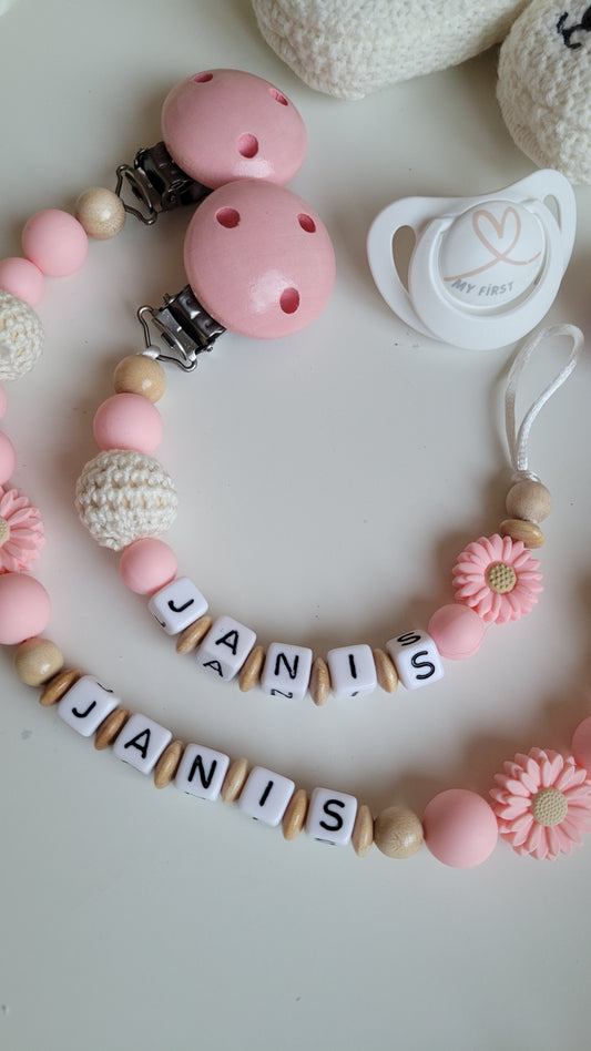 Kinderwagenkette & Schnullerkette mit Namen Blümchen beige apricot