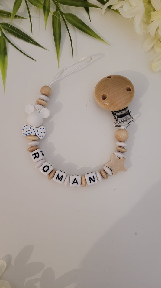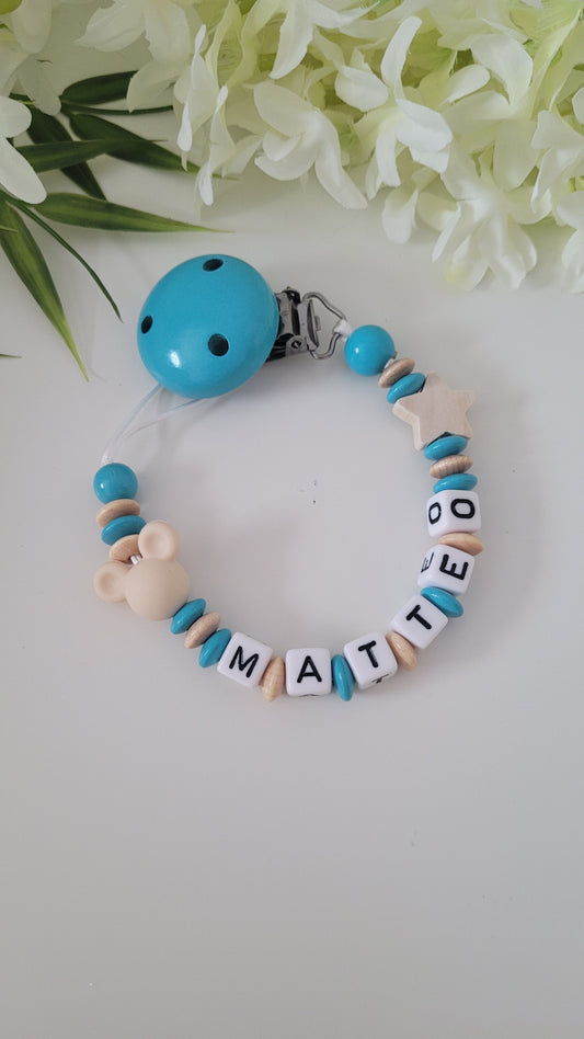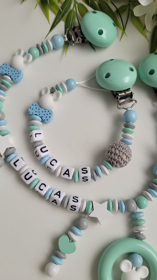 Kinderwagenkette & Schnullerkette Prinz Mickey mit Namen für Jungen mint hellblau