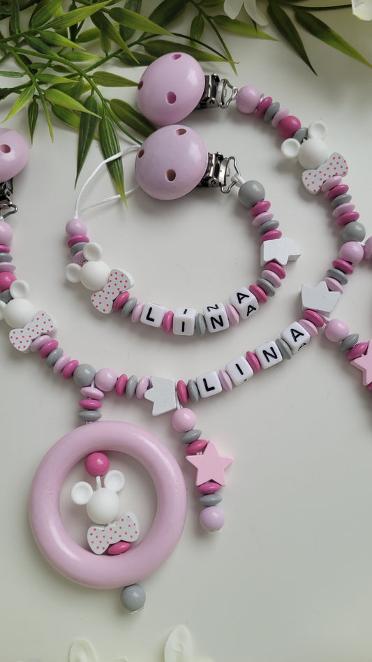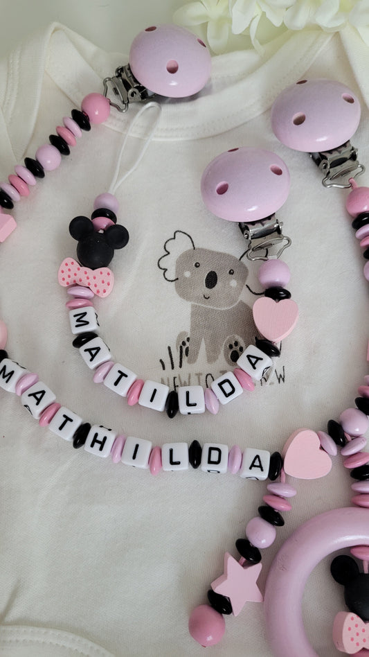 Kinderwagenkette & Schnullerkette Pink Minnie mit Namen für Mädchen