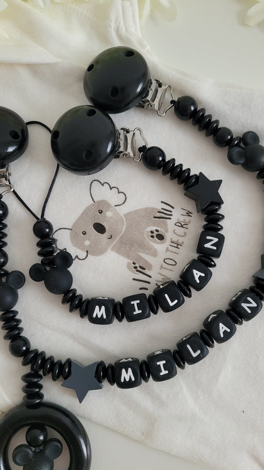 Kinderwagenkette & Schnullerkette mit Namen Maus black Spielringe