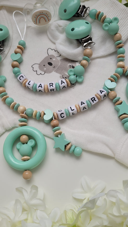 Kinderwagenkette & Schnullerkette Set Maus mint holz