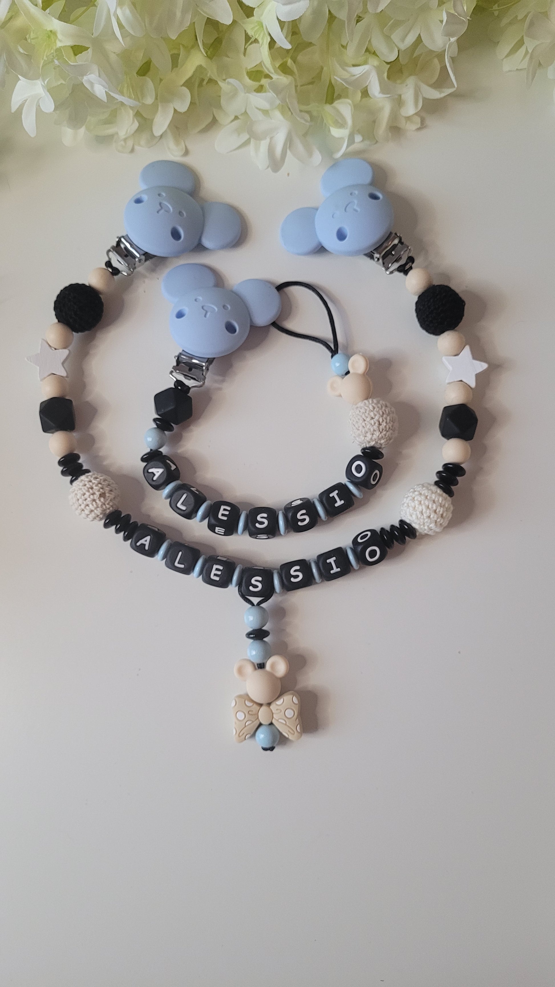 Traumhaftes Set aus Schnullerkette und passender Kinderwagenkette. Sie besteht aus hellblauen, schwarzen und beigen Silikonperlen & Holzperlen. Die Farben sind einfach wundervoll und die Motive so entzückend. Dieses süße Set wird sie verzaubern und ihren Kinderwagen in einen Hingucker verwandeln. Gerne passen wir die Breite der Wagenkette so an, das sie auch an der Babyschale/ Autositz befestigt werden kann.