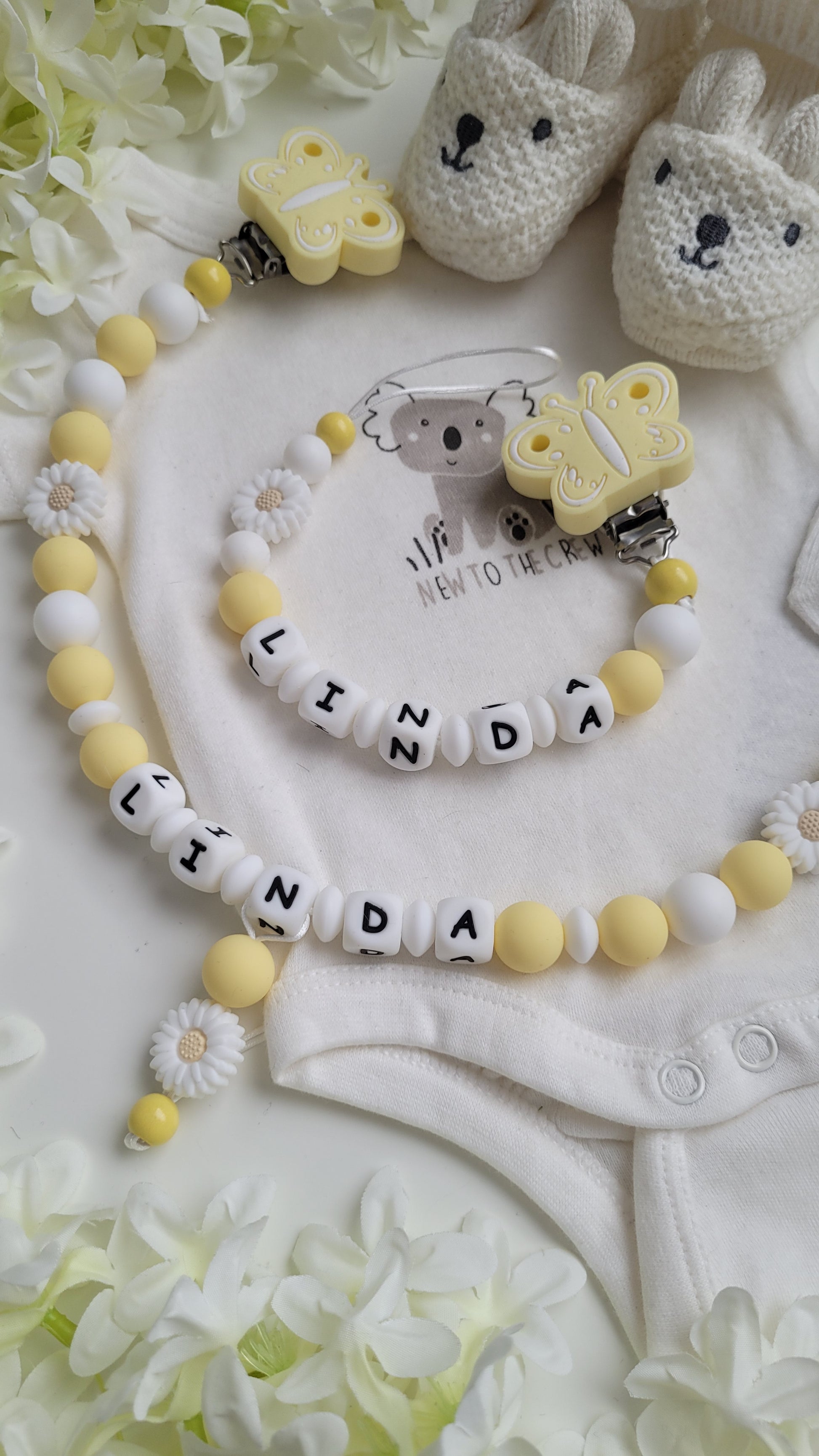 Kinderwagenkette & Schnullerkette mit Namen Gänseblümchen
