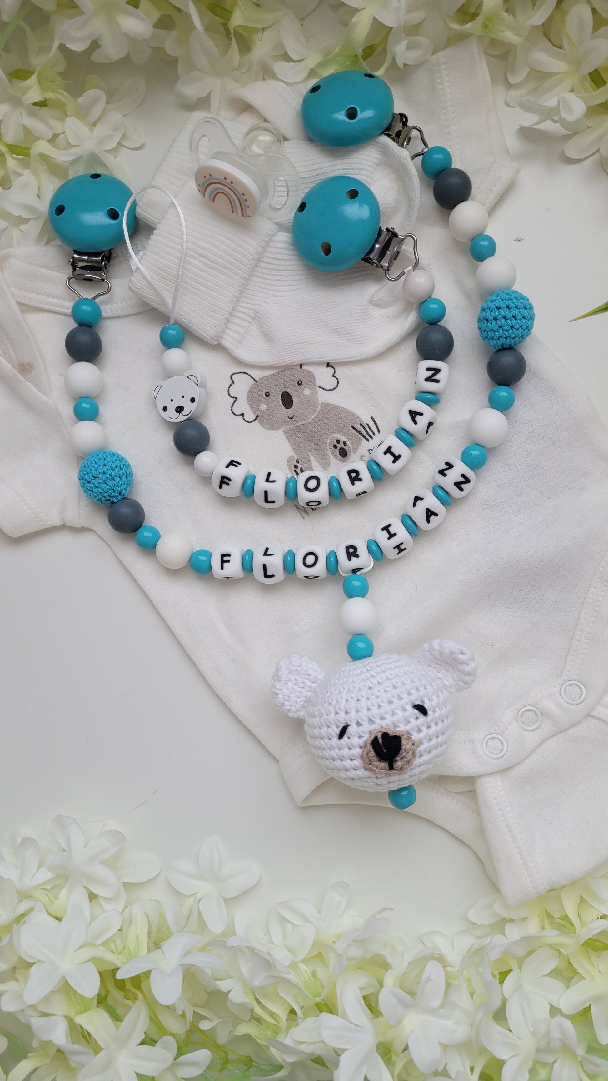 Kinderwagenkette & Schnullerkette Teddybär türkis