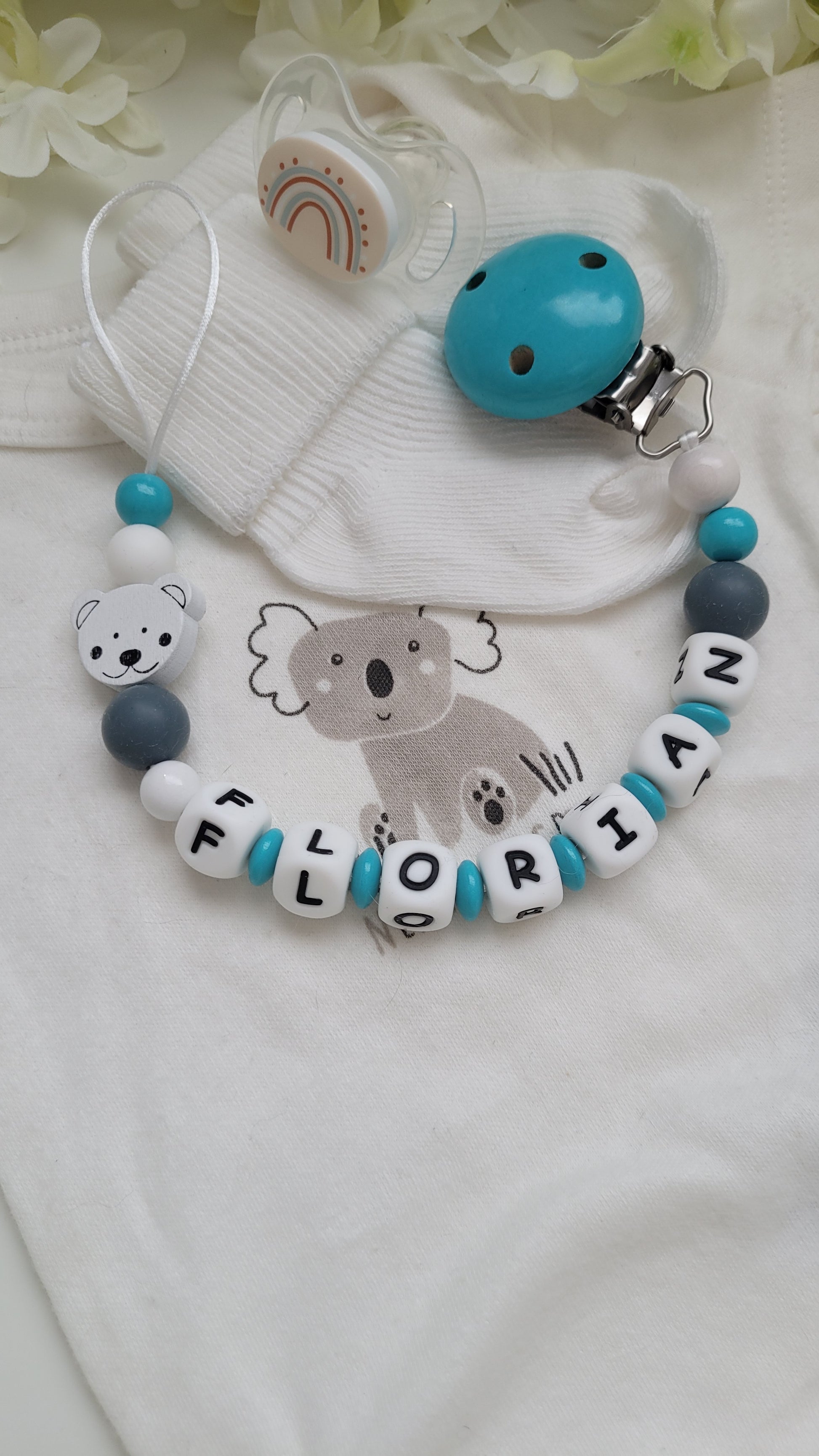 Schnullerkette mit oder ohne Namen 22cm ohne Clip ( bei kurzen Namen fügen wir Perlen hinzu)