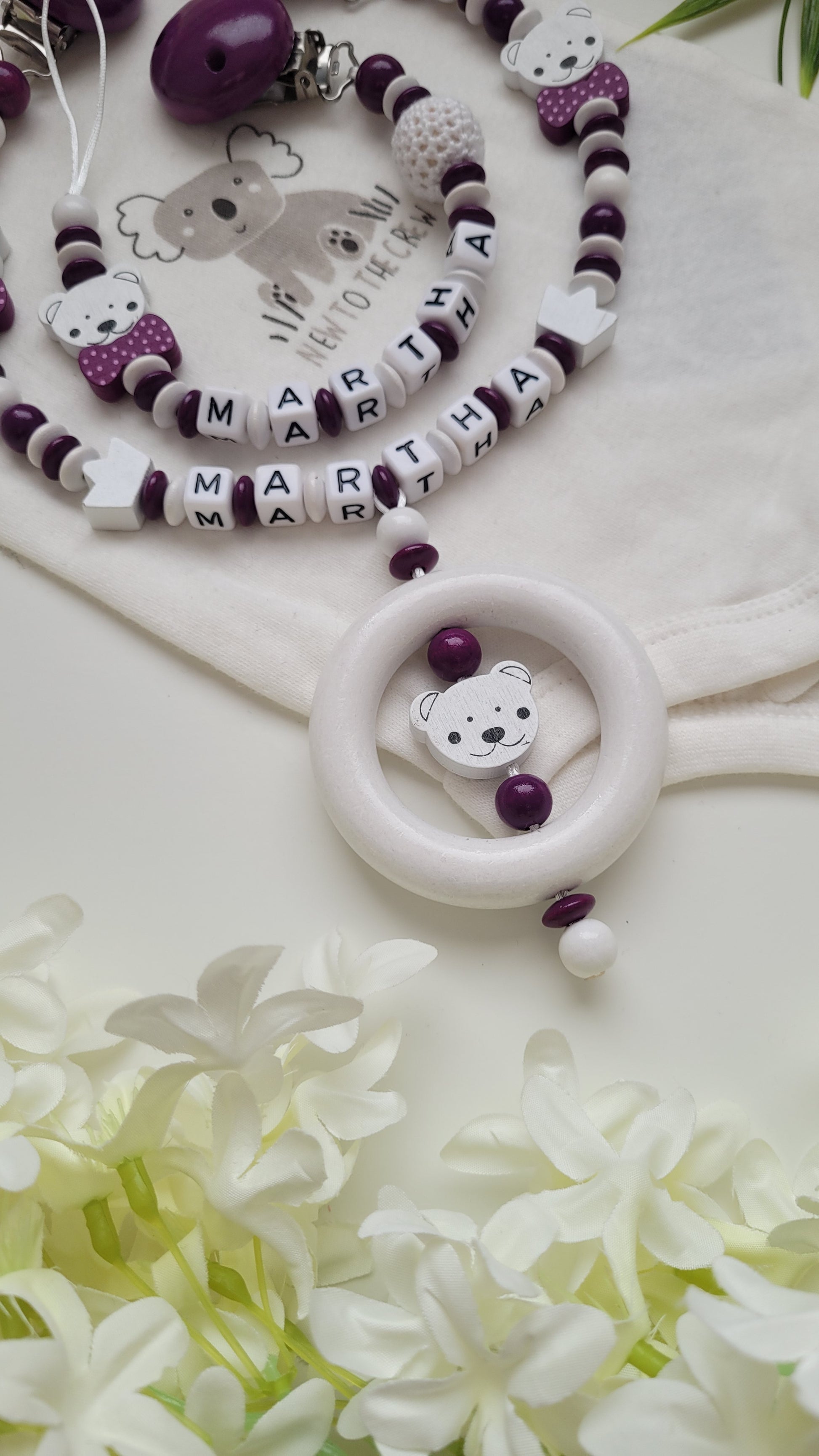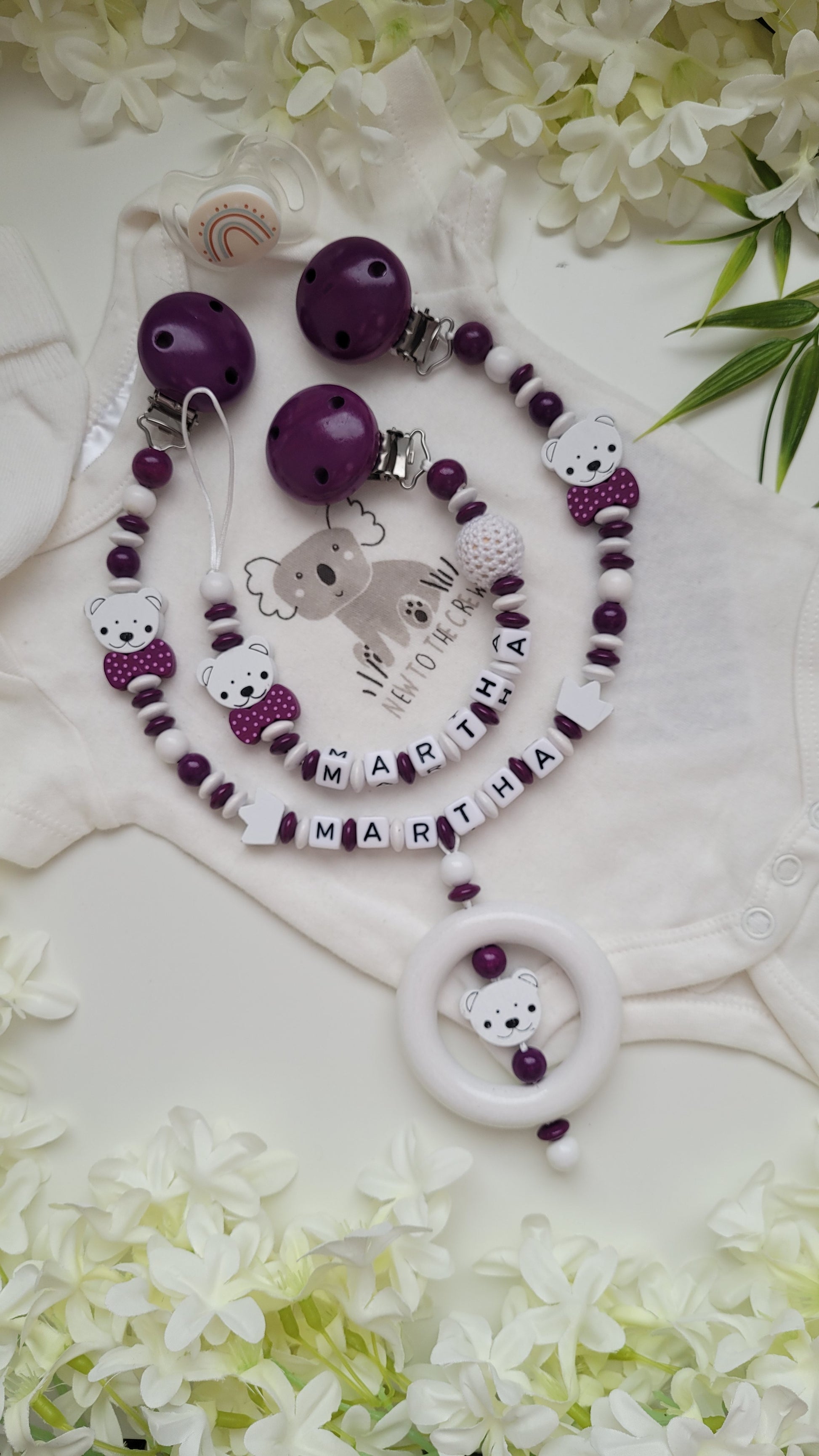 Kinderwagenkette & Schnullerkette Teddybär pflaume weiss