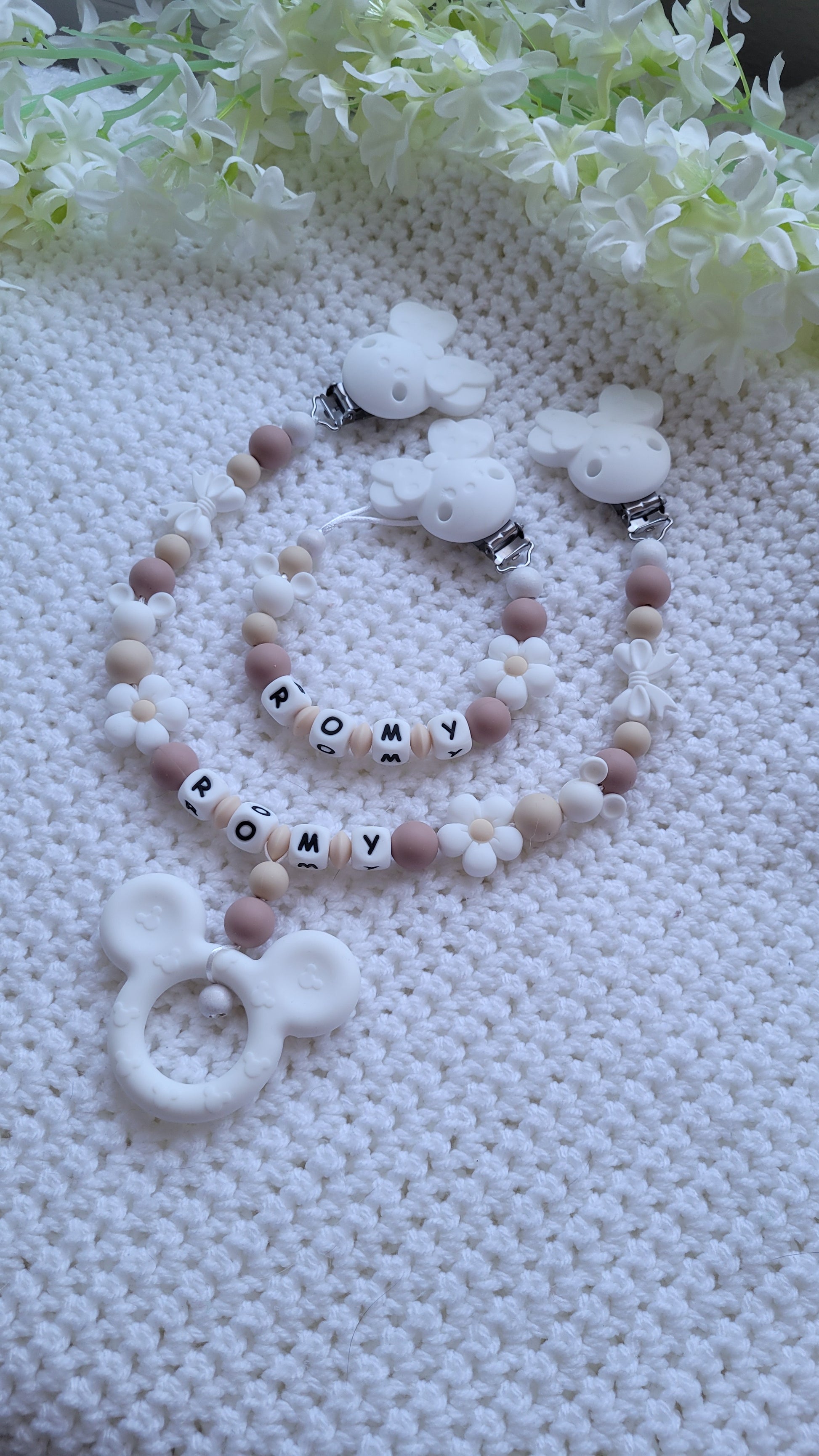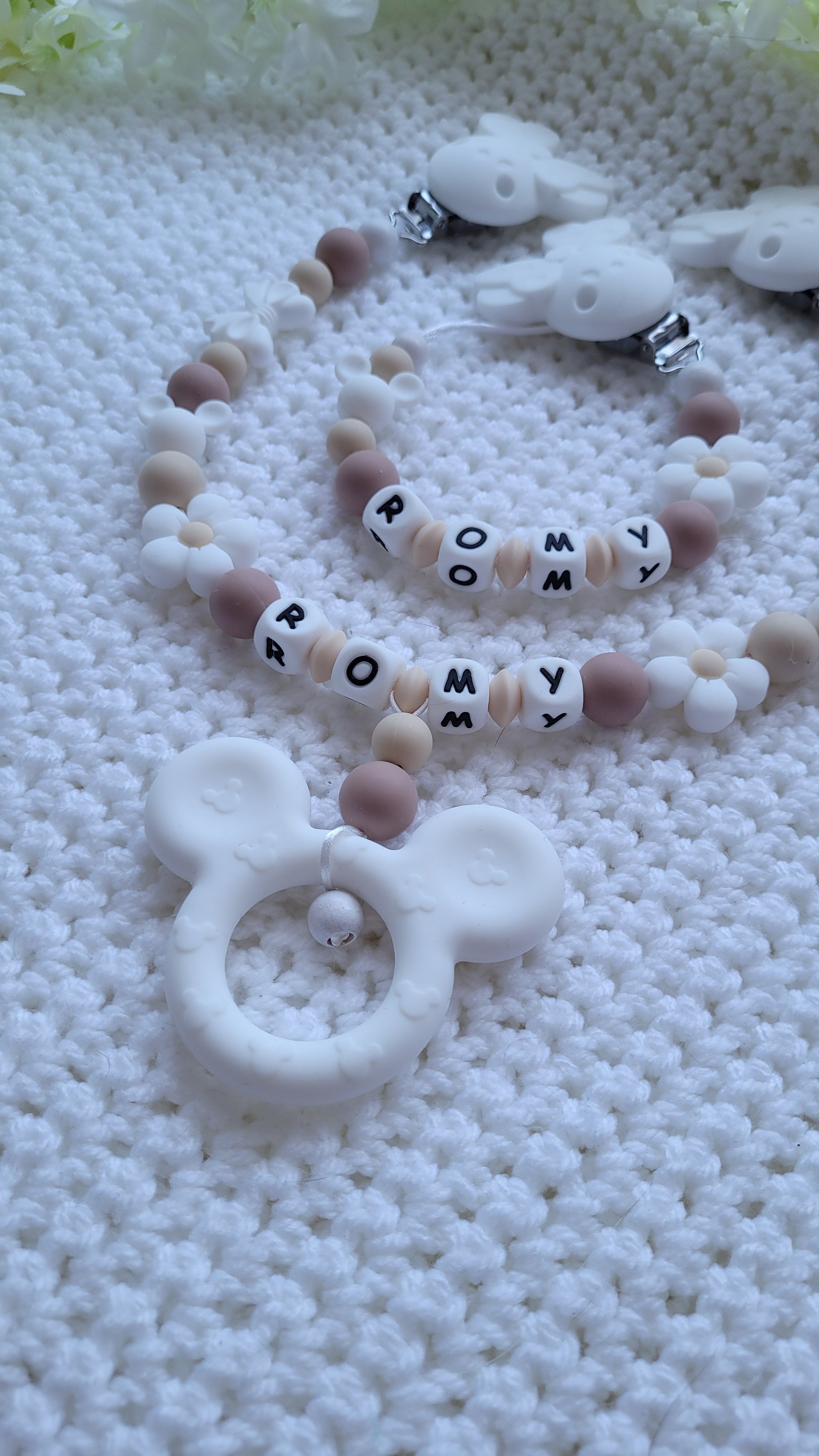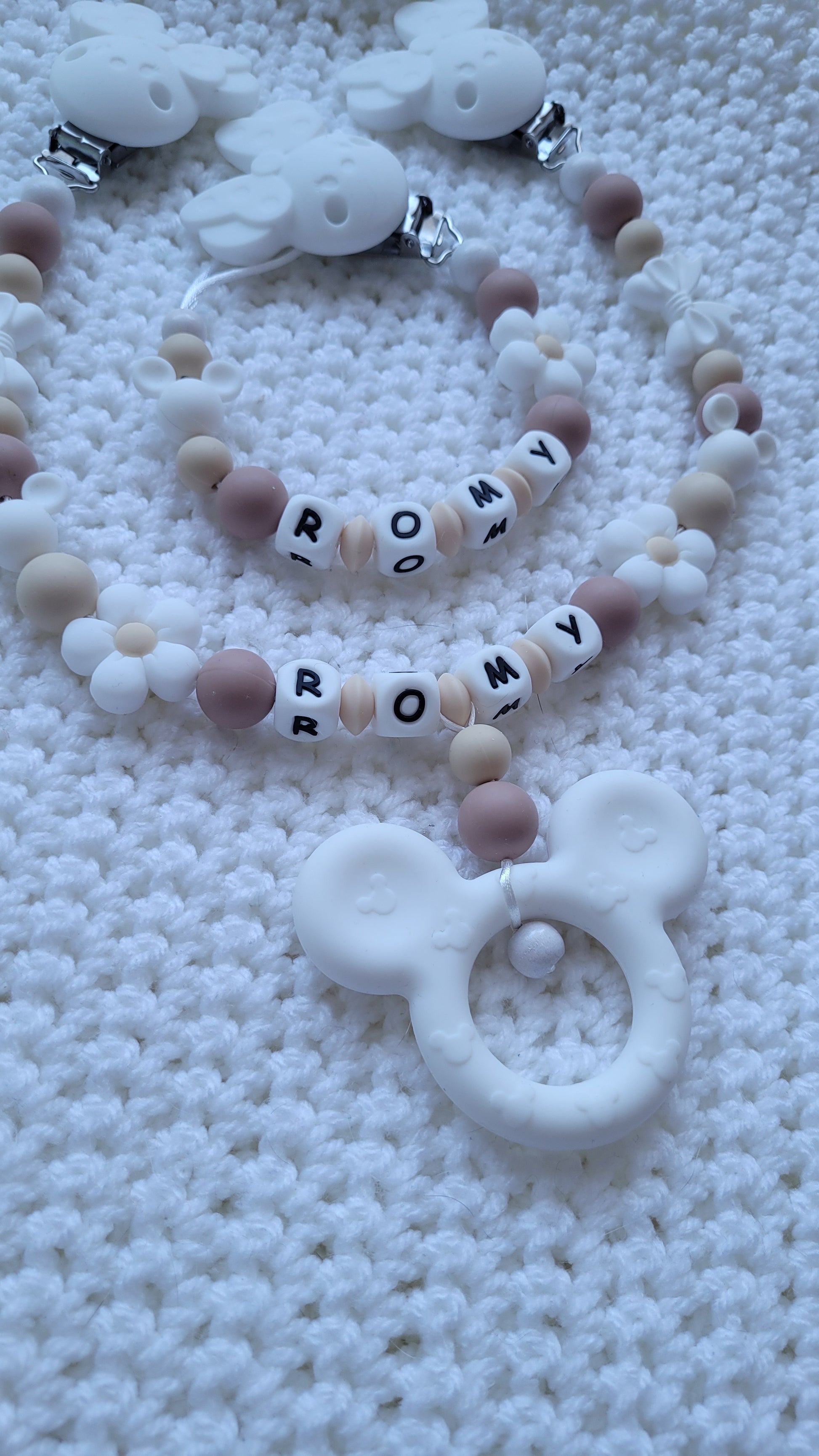 Verspielt und niedlich zeichnet diese schöne Set aus. Zauberhaft mit Blumen und Mäusen aus Silikonperlen