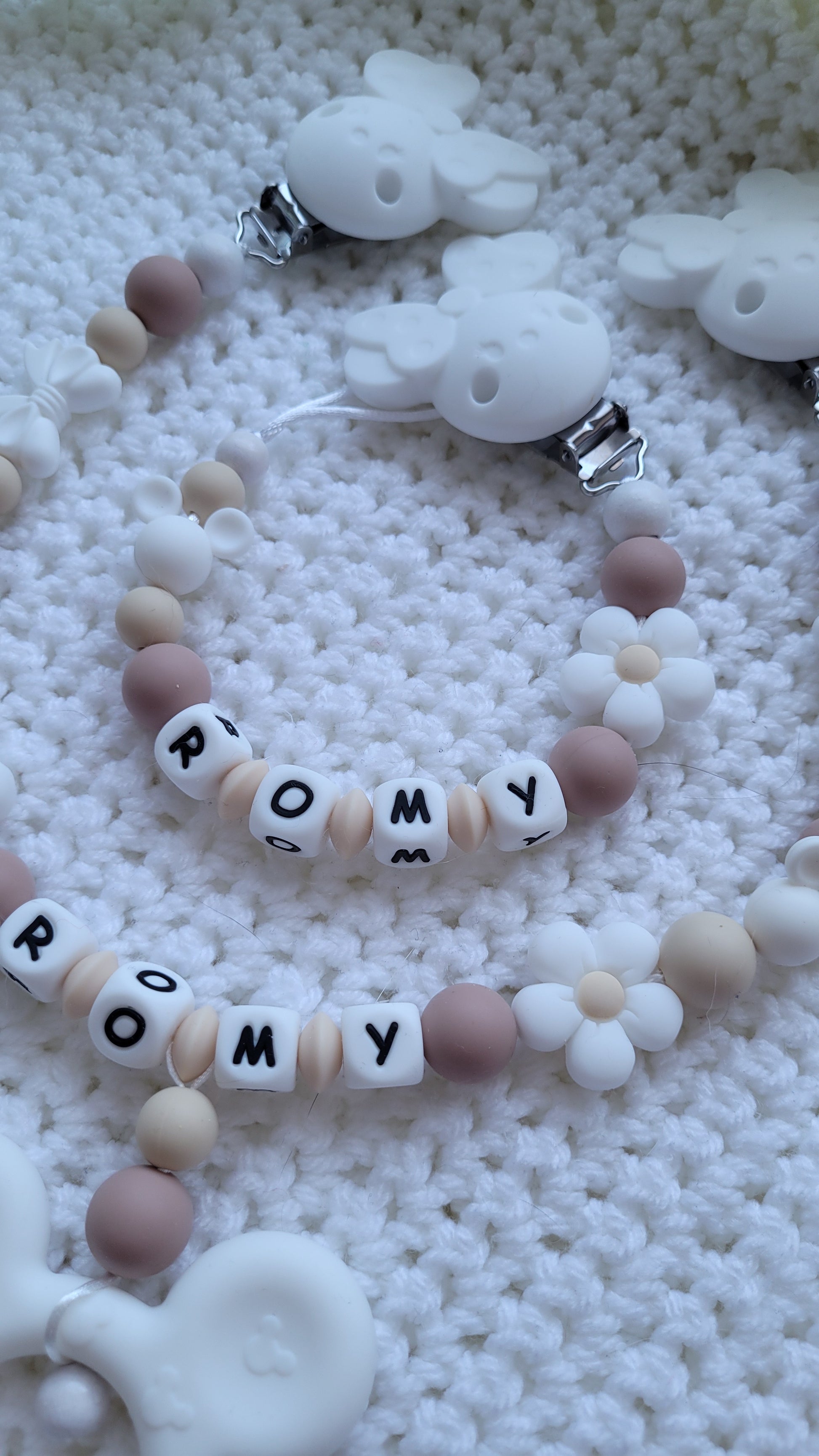 Schnullerkette mit oder ohne Namen 22cm ohne Clip ( bei kurzen Namen fügen wir Perlen hinzu)