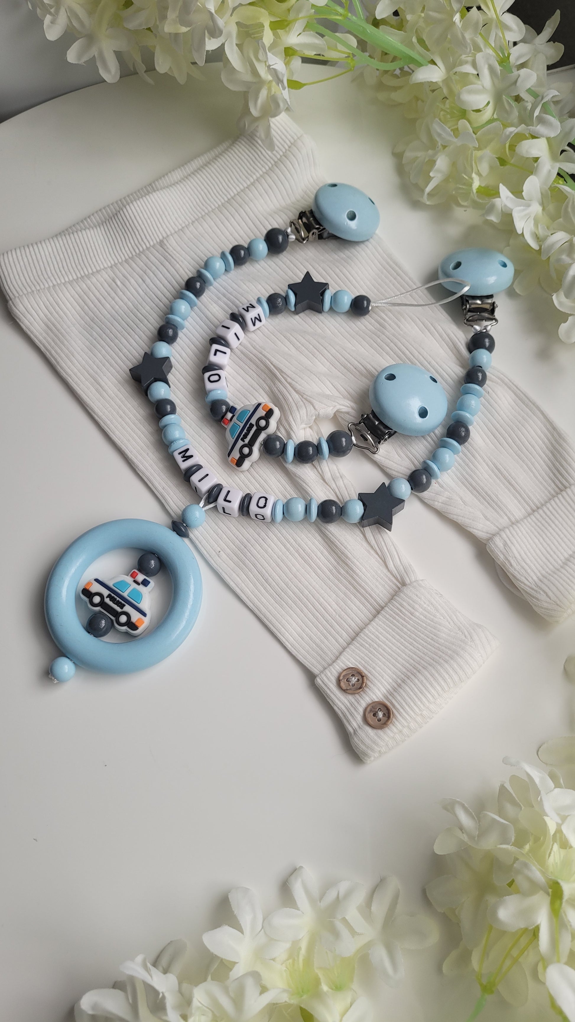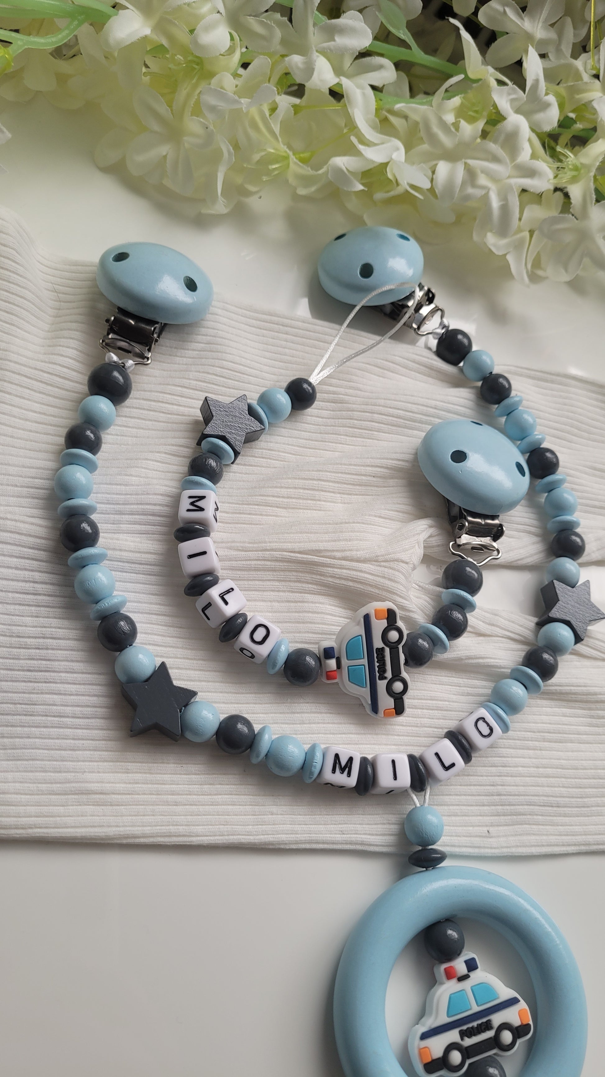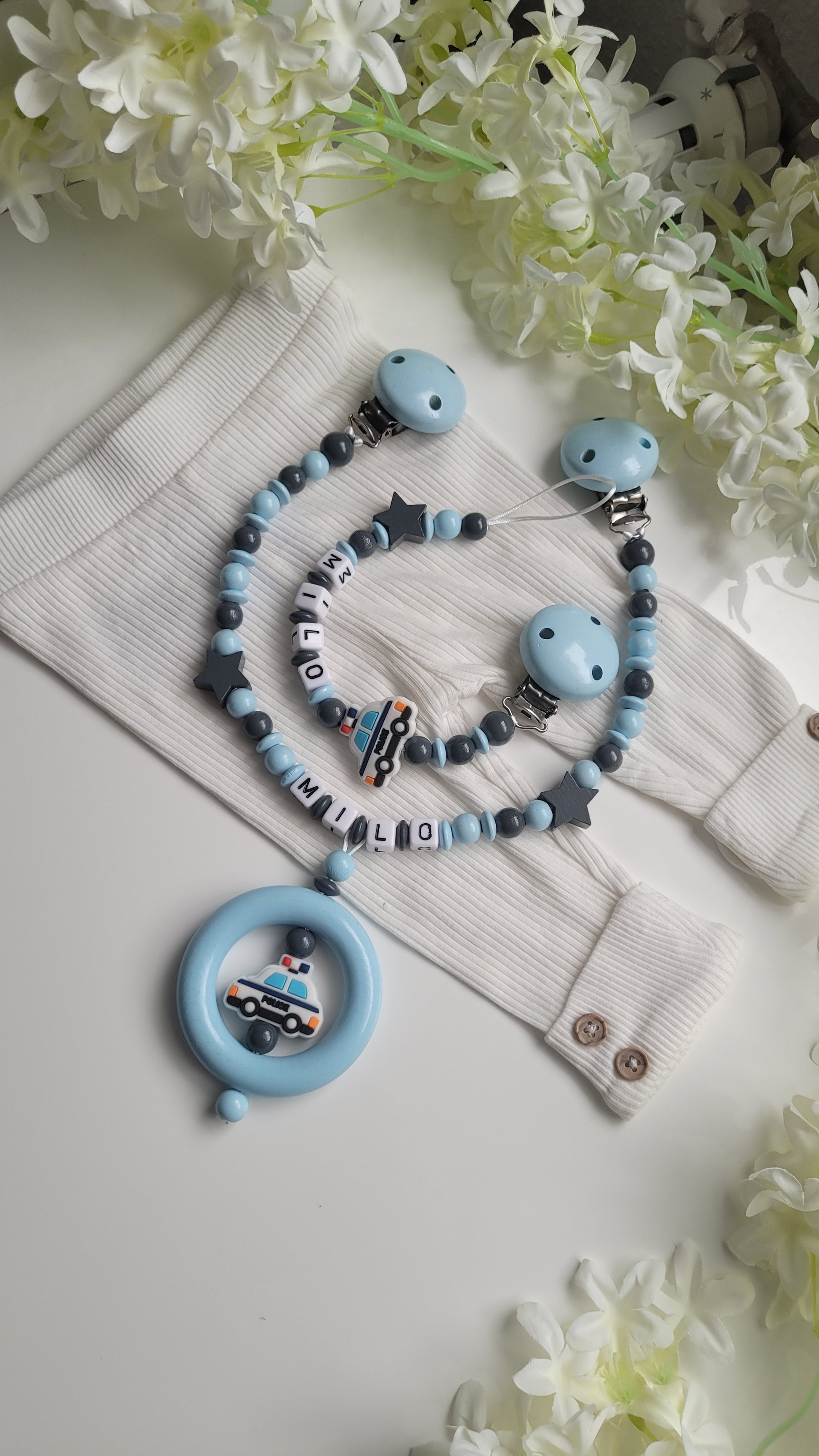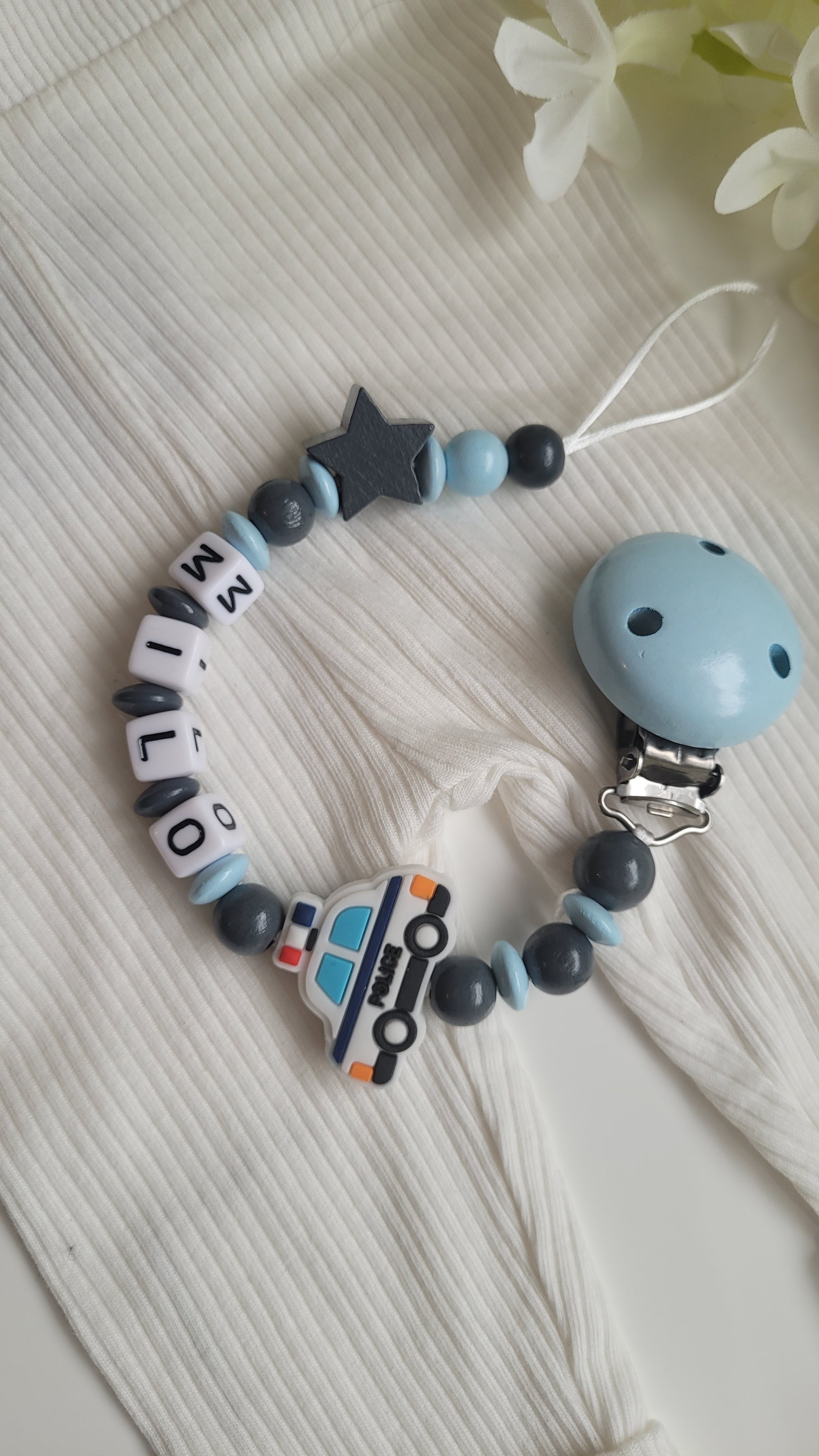 Kinderwagenkette & Schnullerkette mit Namen Polizei Auto blau