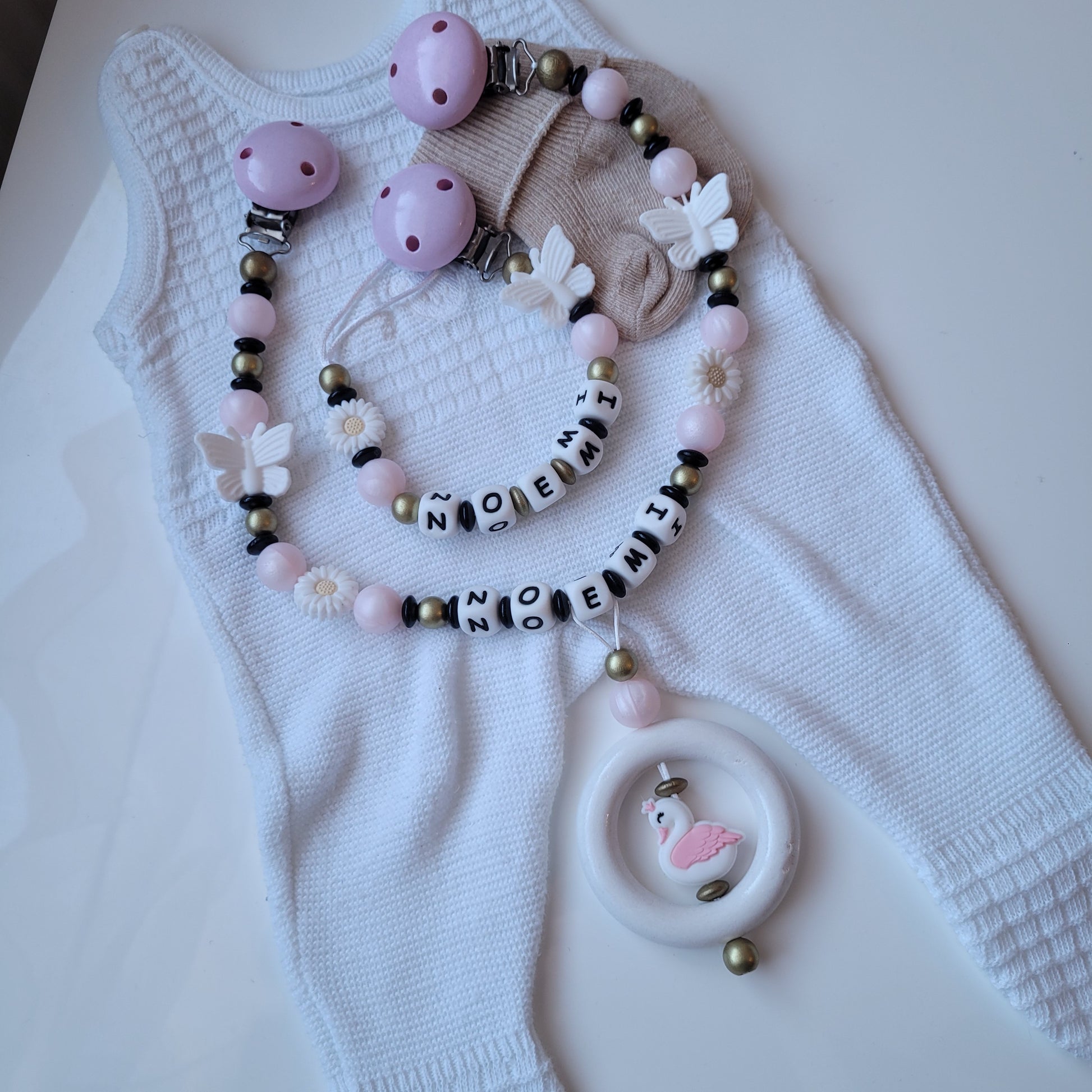 Süßes Set aus Schnullerkette und passender Kinderwagenkette mit süßen Schmetterlingen Schwäne und Blumen