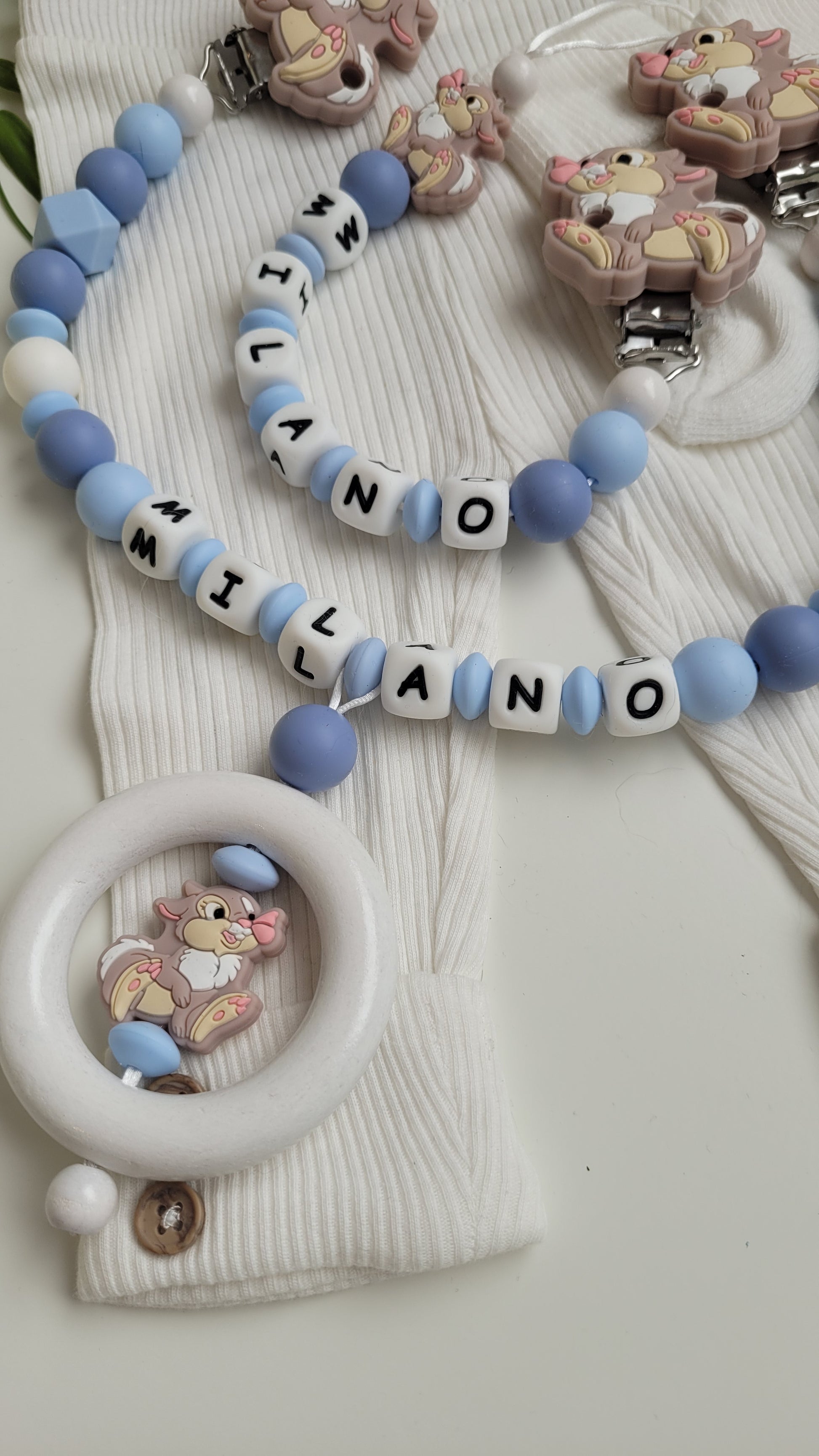 Niedliches Hasenset mit blauen weißen Silikonperlen und dem Holzring