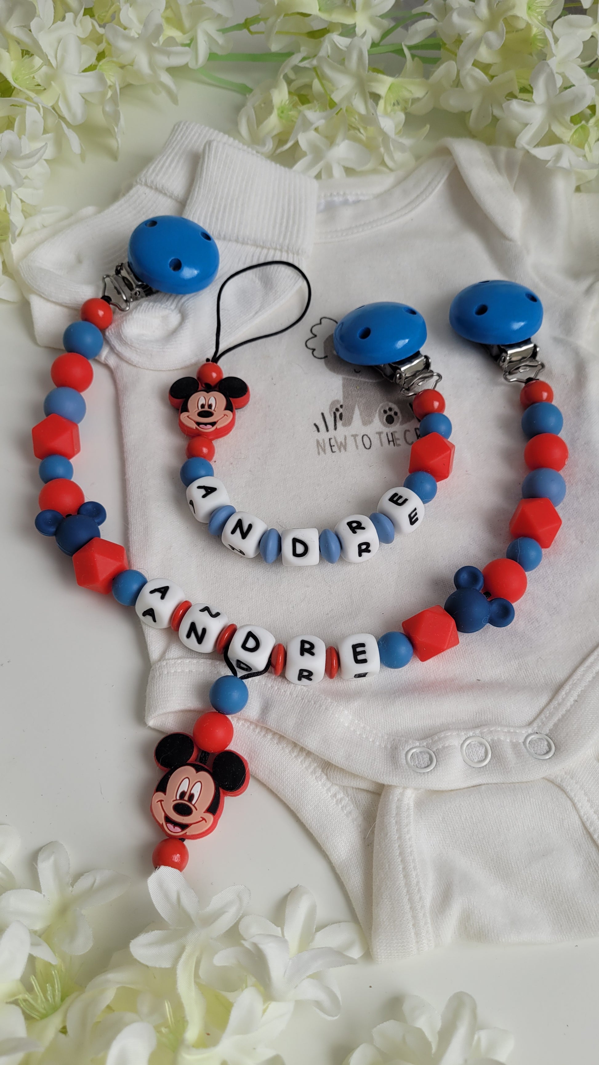 Das Set besteht aus roten und blauen Silikonperlen mit dem süßen Mickey Mausmotiv