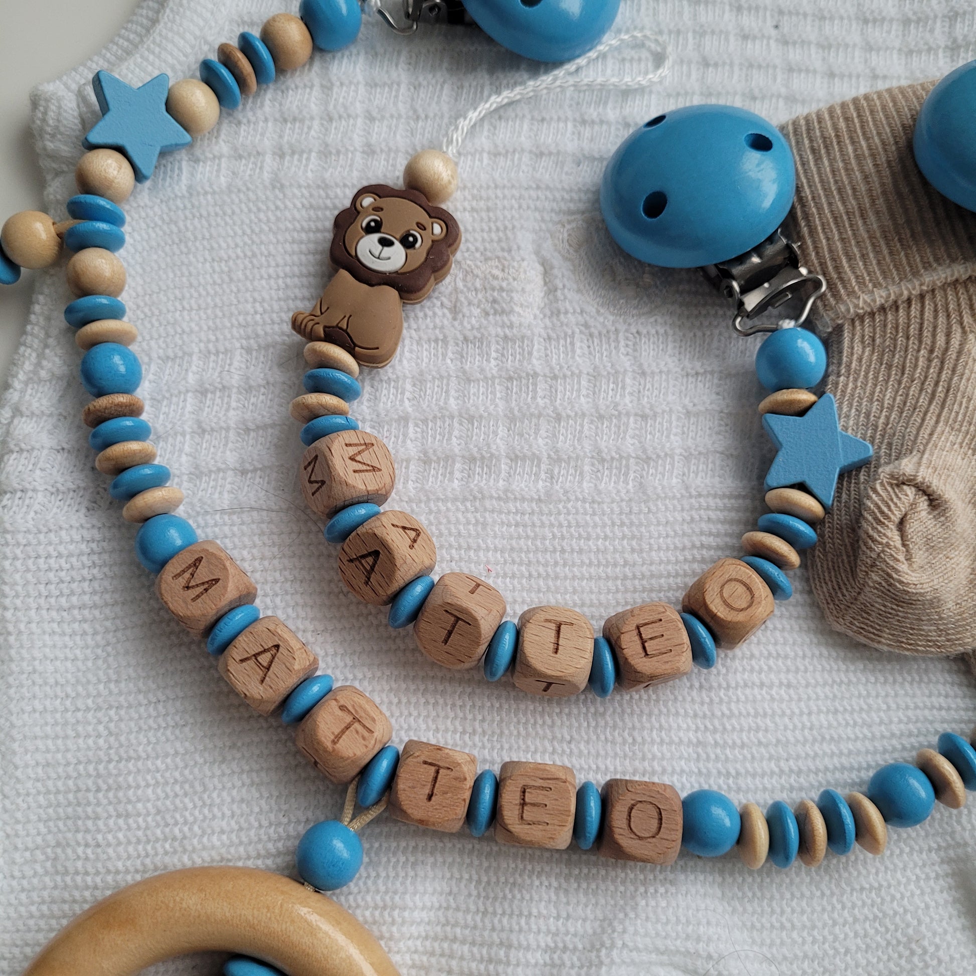 Kinderwagenkette & Schnullerkette Set Baby Löwe Teddy blau