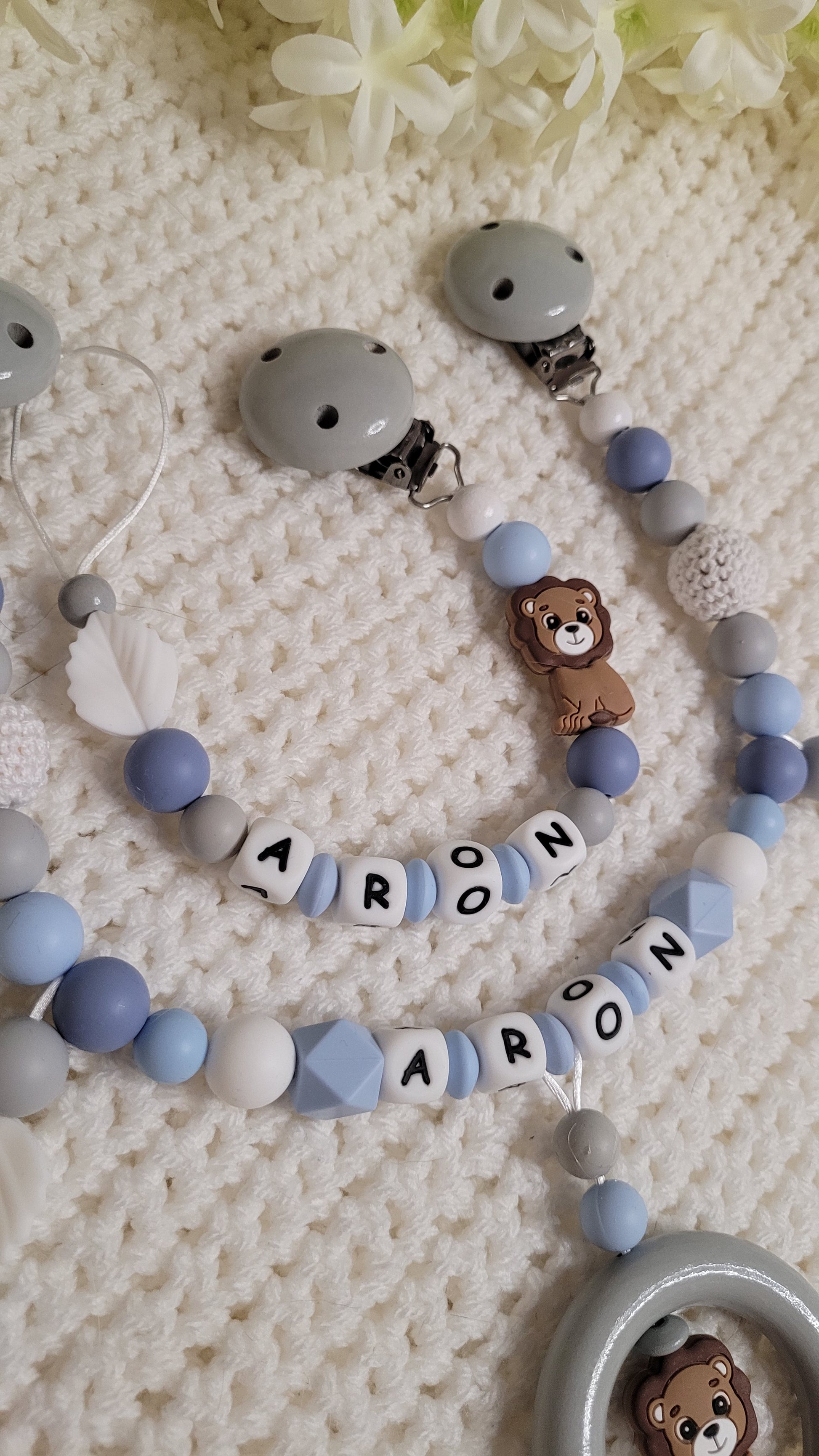 Perfektes Set aus Schnullerkette und passender Kinderwagenkette in sanften Farben für Jungen mit Löwen Motiv Blättern