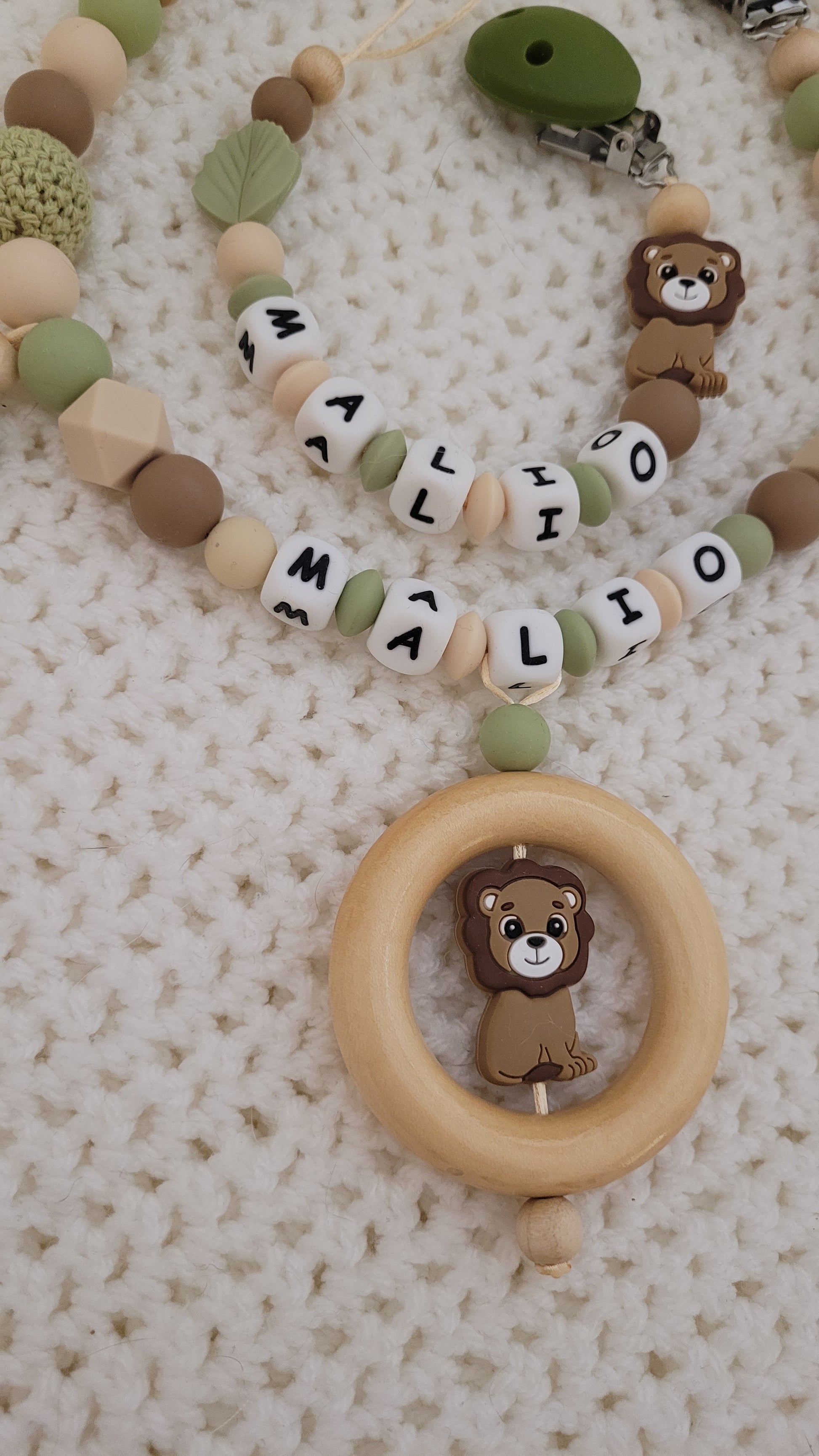 Perfektes Set aus Schnullerkette und passender Kinderwagenkette in sanften Farben für Jungen mit Löwen Motiv Blättern