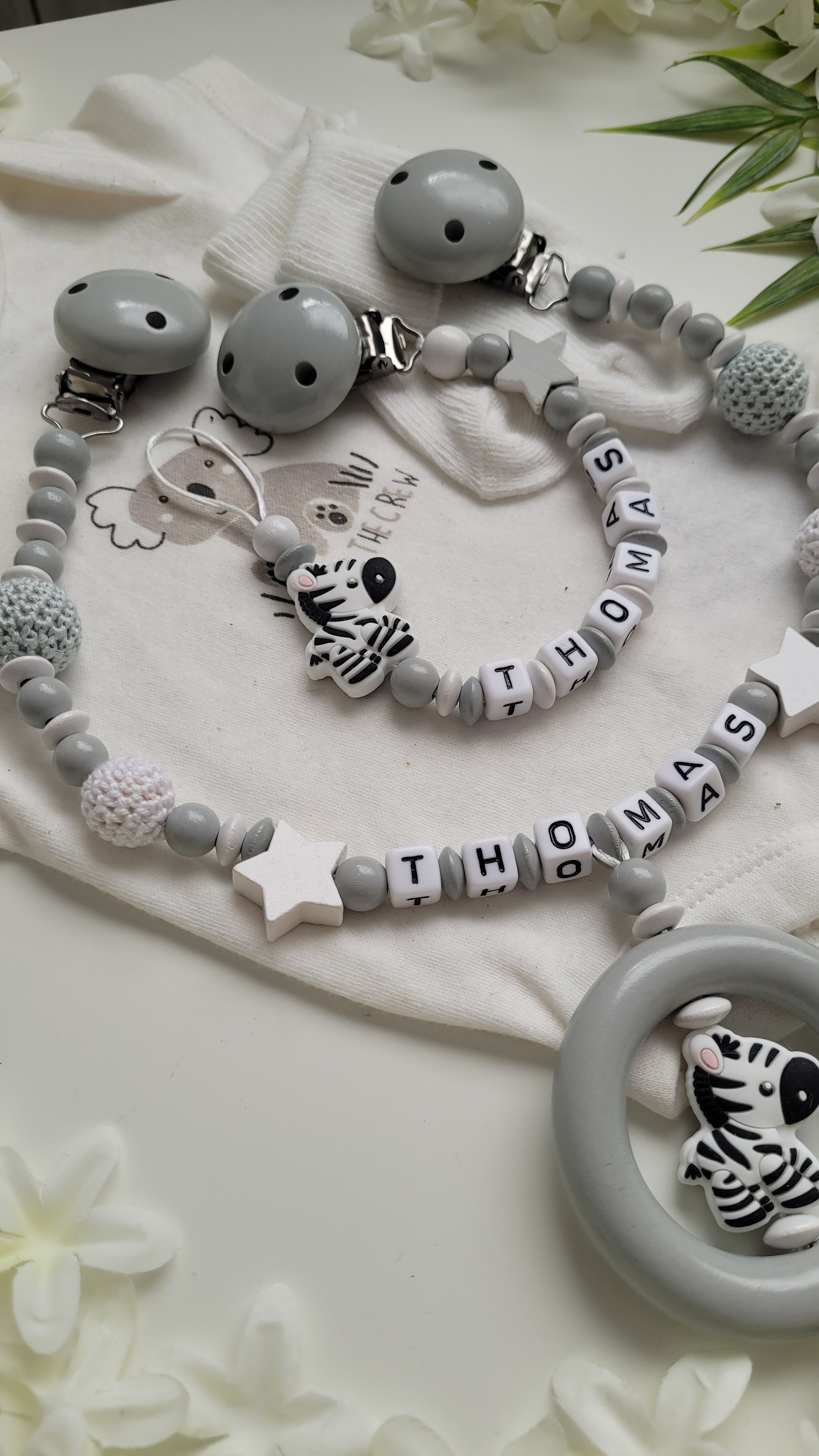 Niedliches Set aus Schnullerkette und passender Kinderwagenkette in grau weiss mit den tollen Zebras